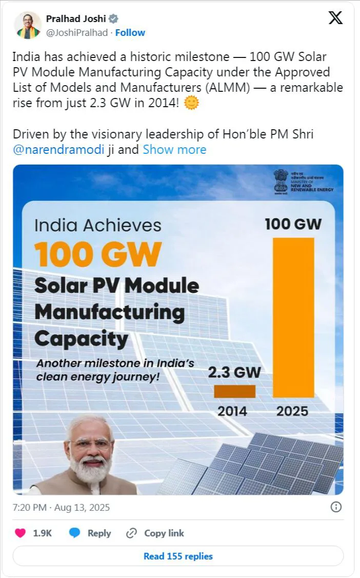 Prahadas Joshi, Indijos naujosios atsinaujinančios energijos aljanso ministras, pabrėžė šį pasiekimą, sakydamas: „Indija pasiekė istorinį etapą – pagal patvirtintų modelių ir gamintojų sąrašą (ALMM) saulės fotovoltinių modulių gamybos pajėgumai pasiekė 100 gigavatų, o tai yra reikšmingas padidėjimas nuo 2,3 gigavato ministro pirmininko pareigų! Narendra Modi ir transformuojančių iniciatyvų varomoji jėga, pvz kaip efektyvaus saulės modulio gamyba susietos skatinimo schemos (PLI), Indija kuria stiprią ir savarankišką saulės energijos gamybos ekosistemą. Šis pasiekimas padidins tempą link Atmanirbhar Bharat ir padės Indijai pasiekti tikslą iki 2030 m. pasiekti 500 gigavatų neiškastinės energijos gamybos pajėgumus.